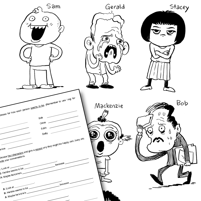 • She seems to be... But really... — An entertaining reference sheet and worksheet, furthering the students' understanding of the phrase "seems to be" by using it to talk about deceptions, wrong assumptions, and surprises.